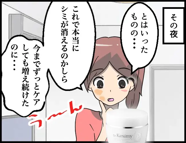 まるで肌が生まれ変わったような感じ!20年ほどシミ悩みを抱え、半ば諦めてました。そんな時娘が「 お母さんこれ使ってみて!」とケシミーを教えてくれました。 どうせ効かないんだろうなと思いながら使ってみた所、唖然。 シミもだけどシワも無くなり「ウソでしょ!?」状態。老けてみられること が多かったんですが、今では-15歳若くみられて毎日が楽しいです。